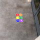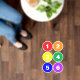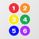 Colorful line up and sit spot floor stickers for the classroom featuring red, orange, yellow, green, blue and purple circles with a number in simple white typography inside. Each circle is slightly under 6 inches in diameter. You can change the numbers in each circle. Each sheet contains 6 stickers -- when finished with one, place it in your cart and start a new sheet for the next 6 numbers.