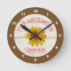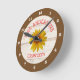 This teacher's classroom clock features a rustic farmhouse theme with yellow daisies on a shiplap background. Red text allows you to add the teacher's name. A perfect accent to any classroom.