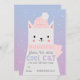 Cute valentine's day card for your child to give out at school. It's an illustration of a white kitten wearing a pink scarf and beanie. The text says "you're one cool cat. i'm not kitten you!" The background is in beautiful ombre color of pink and blue. You can see it is snowing. Funny pun design for a fun valentine's day!