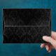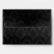 This envelope features faded, script writing of a love poem on the black inside lining. The outside is a luxurious, textured black damask design. The design is lightly distressed for a charmingly vintage look throughout. The return address in the top left corner is customizable, and a frame with a white background has been placed on the outside of the envelope to allow for handwriting of the address