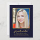 Announce your graduation with this classy photo graduation announcement featuring the word "Graduate" in a stylish script in faux gold foil against a dark blue background with a faux gold foil border around the photograph. Card has a faux gold foil circles pattern against a dark blue background back side.