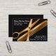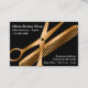 Classy yet simple barber shop business cards designed with gold tone cutting shears graphic and a styling comb in a generic calling card layout you can customize online in tis editable template.