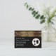 Classy residential or commercial cleaning service business card design template with a black and gold colored cleaning emblem that has a trash can, floor cleaning machine, and cleaning gloves along with a simple layout designed to be customized online. An upscale look on a budget printed on high quality paper stock that is taller than standard says aka euro size business cards.
