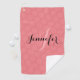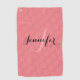 Pretty coral pink polka dots pattern background with elegant script name and monogram centered on towel