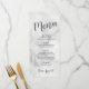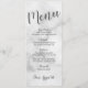 featuring title in grey modern script font with wedding menu details in grey modern sans serif font on white marble background.