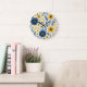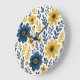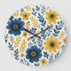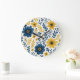 This beautifully arranged wall clock showcases a classic Mediterranean botanical flower design features a vibrant pattern of yellow and dark blue flowers and leaves on a crisp white background. The design is ornate, stylish, and eclectic, making it appealing to artistic crafters and enthusiasts of vintage retro styles. It is available on a variety of modern decor products such as fleece blankets, lamps, and bedding.