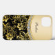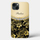 Classy monogram tablet case for iPad Air. Includes simulated rhinestone jewels and a gold floral damask pattern all digitally printed on the cover. Personalized the monogram space would your name initials in this elegant design that lets you carry your cellphone in style.