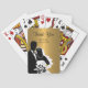 Classy gold and black wedding favor guest playing cards with bride and groom graphic design silhouette, gold colored background, along with bride and groom monogram name drops you can customize with your wedding date, bride and groom name in style. Designed as wedding guest favors with a touch of class.