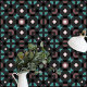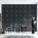 Bring a touch of Moroccan luxury and contemporary elegance to any room with this stunning dark geometric wallpaper. The design features a sophisticated repeating quatrefoil or ogee pattern in a mesmerizing color palette. The bold, rich black background provides a dramatic contrast for the accent colors. Eye-catching interlocking shapes in teal blue (or turquoise/aqua) and dusty rose pink (or mauve/blush) create a modern, elegant grid. The center of each geometric element is adorned with a stunning, photorealistic pink gemstone or facet-cut jewel, adding a touch of glam and shimmer. This is perfect for a maximalist or luxury-inspired interior.