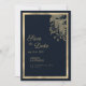 Glam vintage classy navy blue and gold luxury lace floral Wedding Save the Date invitations. It is perfect for any refined and sophisticated girl or anyone. This design is ideal for a trendy and elegant party event. Customize this design with your message and personalized information. All designs are printed.