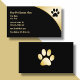 Classy Pet Care Business Cards with simulated gold image of a dog paw with a great text layout you can personalize now. Elegant pet care profile card that makes a great template for a vet tech, pet sitter, animal hospital or pet supplies.