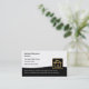 Classy business cards with a gold tone Realtor house symbol emblem and classic editable layout you can customize online created for a real estate professional in the realty industry.