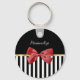 An elegant basic keychain featuring vertical black and white stripes, embellished with a chic FAUX gold colored stripe and a picture of a classy red ribbon style bow. Personalize it by adding the name of that special girl in your life. Flat printed image, NOT metallic or actual bow.
