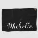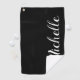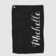 Go golfing in style with this Classy Script Black and White Personalized Womens Golf Towel. It is modern designed with name in trendy white calligraphy script lettering on solid black background. You can customize to any color you wish. Perfect gift idea for a lady golfer!