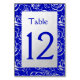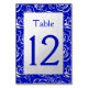 A simple table number card featuring a silver floral motif on a rich royal blue background. You can change the color and the font style in the customize menu. This is part of a matching wedding suite which includes an invitation, menu and many more items.
