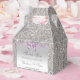 Personalized elegant custom silver and lilac favor boxes for weddings or any event with a beautiful printed silver sequins pattern, a cute shiny lilac printed bow and ribbon and pretty printed diamond bling jewel. Text, font and color of font can all be customized. If you need assistance customizing your product please contact me through my store. I will be happy to help. I have matching products in my store.