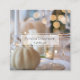 Business cards with a beautiful classy photograph. A Thanksgiving holiday table featuring fine china and glassware. Fancy golden bokeh lights in the background. A single off white gourd sits on top a plate.