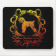 Beautiful, elegant Black Russian Terrier products, with a weathered look for a cool retro vibe. The dog breed silhouette is in the center, surrounded by swirls, and the name is printed underneath. Printed in a firey yellow to orange red fade. On a variety of Black Russian Terrier t-shirts, mugs, and other merchandise.