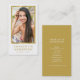 Modern business card featuring a faux gold foil surrounding a photo that you can replace with your own against a white background on the front and a gold like color back side. This social media business card is ideal for actors, actresses, models, musicians or anyone that need a photo on their business card and want a way to let the people they meet in real life know how to contact them and find their work/portfolio online and on social media.