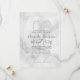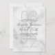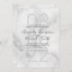 features bride and groom's name in grey modern script font style and details in grey sans serif font style with large date in light grey as background on white marble background.