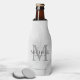 This bottle cooler features personalized groomsman's name with title and wedding date in grey and monogram in light grey as background, in classic serif font style, on white marble background.