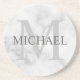 features personalized name in grey and monogram in light grey as background, in classic serif font style,