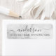 This return address label features personalized family name in grey modern script font with address in grey modern sans serif font on white marble background.