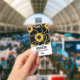 A name tag with an elegant and stylish pattern. Pretty yellow sunflowers and green leaves surrounded by delicate gold chains. Black background.