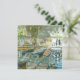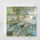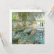 Claude Monet. Bathers at La Grenouillère. Summer landscape in green tones. There are several boats on the river bank. In the middle shot there are people standing on the pier. There is a blue sky in the background. Reproduction of famous works of art images in the public domain.