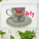 A fun kitchen towel showing clean or dirty china cups. The dirty coffee cup has a red lipstick stain.