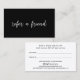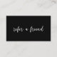 Modern referral card featuring a simple and minimal design with "refer a friend" in an elegant script over a black background The back has your social media icons and contact info. You may remove change, add or remove the icons in the design editing tool. These mimimal referral cards are great for any business.