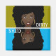 This design features a woman on the dirty side with a scowl, on the clean side a pleasant smile. She has a full afro and red lips.