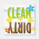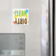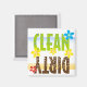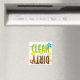 This dish washer magnet is digital illustration and text design. Clean is in clean lime green and Dirty is in dark brown.