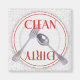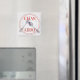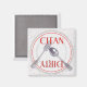 This dishwasher magnet has an illustration of a white dinner plate with a red stripe and textured red edge, and photos of a fork and spoon on the plate. The plate sits on a textured gray background looking like granite. It says CLEAN in red type on one side of the plate, with the word DIRTY, in "dirty" red letters, on the other side.
