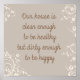 This pretty word art design features a tan background, almond colored floral swirls and text that reads, "Our house is clean enough to be healthy but dirty enough to be happy".