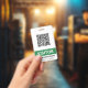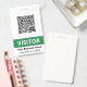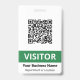 Vertical visitor badge with a qr code, VISITOR in clean white letters against a green stripe, and your business name and department or location. All text is customizable. Green and white QR code visitor badge for your business.