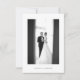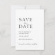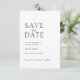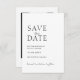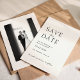 This wedding save the date invitation features a clean and elegant minimalist design. The front showcases a modern mix of serif and script fonts on a white background with a simple, balanced layout. The back highlights a black-and-white couple photo framed with white space, with their names subtly placed below in a classic serif font, creating a timeless and refined look.