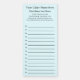 This clean magnetic notepad design features a business/professional/practice/etc. name, a representative’s name, contact details, and to-do list style lines with an arrow shaped check box. It might be used as a promotional or advertising item given to current or potential customers.