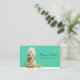 A fun simple business card featuring a dog wrapped in a towel, wearing a eye mask, with his paws outstretched ready to be pampered. Presented on a teal green background. There is plenty of space to add your business details as you wish.