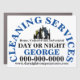 Elegant, classy and stylish profile cards for your company in the cleaning industry, featuring a city and manufacturing plant skyline with one half representing night and the other day, with the silhouettes of men and women holding buckets, brooms and pressurized window "cleaning materials".