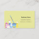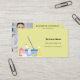 A light yellow background decorated with cleaning equipment. Personalize and add Your photo, name, text contact info and your own QR code to your website address. Black text.