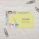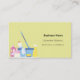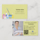 A light yellow background decorated with cleaning equipment. Personalize and add Your photo, name, text contact info and your own QR code to your website address. Black text.