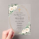 Elegant white roses are nestled in sage green leaves and decorate a gold fame. A gold cross tops the text. Acrylic invitations are the hottest design trend of the season.