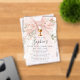 Blush pink watercolor coquette bow is decorated with roses and sage green greenery. A gold chalice with host is placed above the text. The back is a chic pink and white stripe pattern. Your daughter's name is written in a beautiful calligraphy script. All text is editable.
