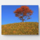 A peaceful 3D landscape in fall, created in Vue. On top of a hill covered with tall golden grass, against a clear blue sky, a solitary orange maple stands with a wooden bench under it to stop and rest on.