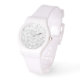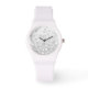 I only have one complaint. I ordered the watch with clear case and strap, and what was sent was white case and strap. I'm going to keep it because 1) it looks very nice in white, and 2) it would take too long to get a replacement made and sent in time for my occasion. Aside from the mix up with the color, the watch does look very good in white. The purple dial is actually sparkly which did not show in the online images. That was a nice surprise. If you like Swatch watches this is very similar to those. It's 33.6mm in diameter, 10.5mm thick, and 40.6mm lug to lug. Stainless steel case back says 3ATM/30m WR, so no swimming or showering or submerging this one. If you like Woodstock, this is a great choice.