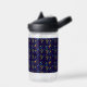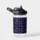 Clear plastic sippy cup with a dark blue sleeve featuring colorful confetti-like patterns. The cup has a black lid and spout. Displayed front and back.