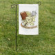 Flag bracket is super easy to assemble. There is a prong fork that goes into the ground. I dug a shallow hole to bury the prongs and still had enough height. Reinforced stitching on for the flag opening. Colors are true to the website. Mona Lisa's sign with the text is easy to read, the text is clear and not blurry.