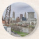 The Cleveland, Ohio skyline on an overcast day with the Cuyahoga River running below
