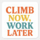 Celebrate your passion for adventure with this bold “Climb Now, Work Later” sticker. Featuring retro-inspired typography in vibrant orange, yellow, and teal, this design is perfect for rock climbers, hikers, and outdoor enthusiasts. Stick it on your gear, water bottle, or laptop for a fun reminder to prioritize adventure. A must-have for weekend warriors and nature lovers alike.